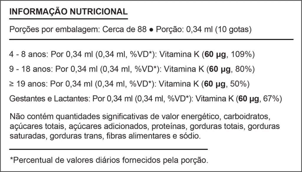Vitamina K2 (Menaquinona-7). Agente de massa: Glicerol, água. Emulsificante: lecitina de soja. Antioxidante: DL-alfa-tocoferol.